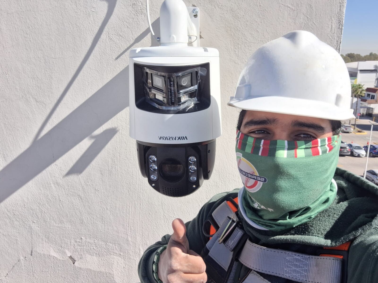 Instalación de cámara profesional PTZ realizada por Gustavo Alanis supervisor del proyecto, a 14 metros de altura en grúa de brazo articulado y con equipo de seguridad altamente calificado.